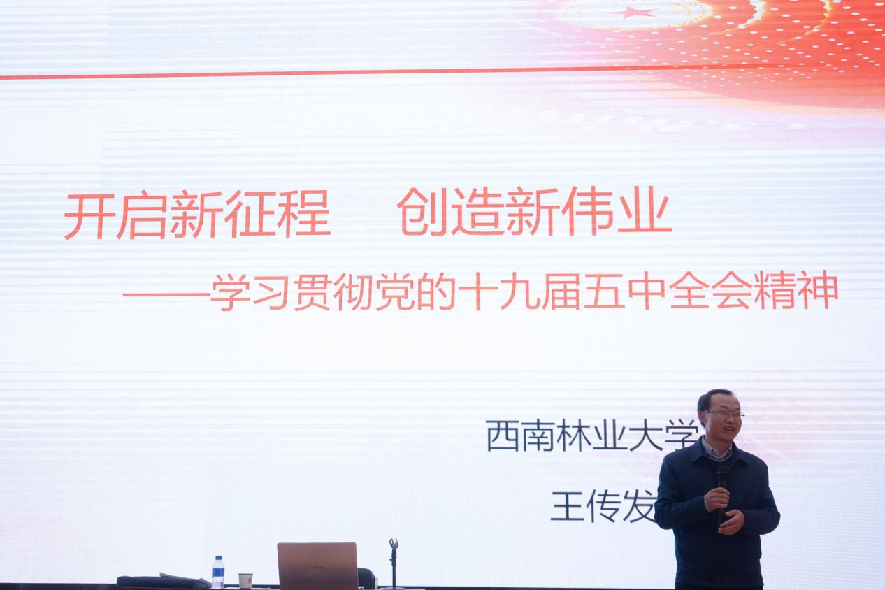 为进一步落实“万名党员进党校”培训任务,深入学习贯彻党的十九届五中全会精神,2020年12月25日下午14:00,雷竞技raybet登录入口开展“万名党员进党校”暨深入学习贯彻党的十九届四中全会精神和习近平总书记考察云南重要讲话精神系列讲座第六讲《开启新征程 创造新伟业——学习贯彻党的十九届五中全会精神》集体学习活动。本次党课由雷竞技raybet登录入口副院长申斌副教授主持,省委宣讲团成员、西南林业大学马克思主义学院院长王传发教授主讲。
