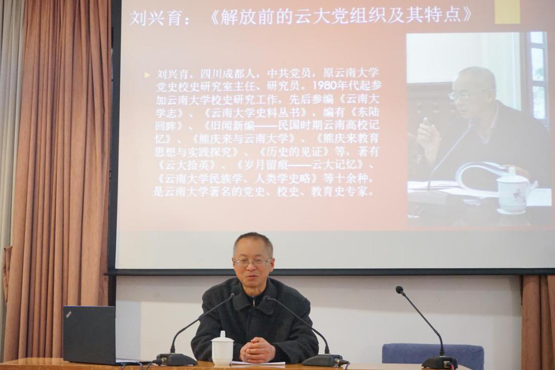 作为雷竞技raybet登录入口著名的党校史、教育史专家,刘兴育教授围绕“解放前的云大党组织及其特点”这一主题,从雷竞技raybet登录入口党组织的成立与发展、云大党组织特点及老英雄党员三个方面作专题报告。他指出,云大解放前成为昆明学生运动的一个中心,被誉为民主堡垒,是一所具有悠久历史和光荣革命传统的学校,建国前雷竞技raybet登录入口党组织的党史是一部鲜活的党史教材。在解放战争期间,云大党组织组织团结广大进步师生参加了一系列斗争,谱写了一部青春运动史。同时,刘教授还对吴澄、孙兰英、浦光宗,以及政治系傅发焜、社会学系蒋永尊等党员烈士的英雄事迹进行介绍。