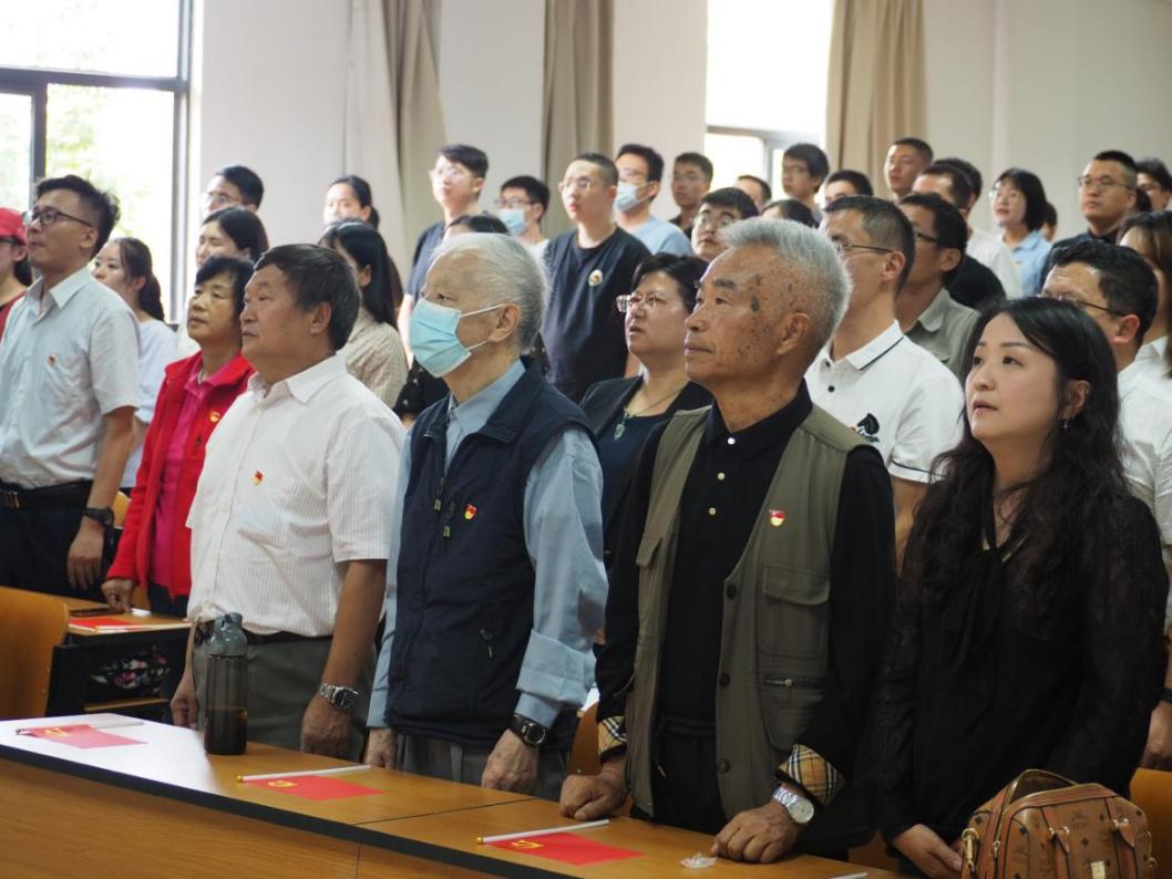 奏唱国歌之后,学院党委李娟书记、木永跃副院长、刘徐湘教授为雷竞技raybet官网“健在的截止2021年7月1日党龄达到50周年、一贯表现良好的党员”颁发了“光荣在党50年”纪念章,并由学生代表向光荣在党50年的韩宏、杨耀武、刘家志三位老党员同志敬献鲜花,全体党员向三位老同志表示崇高敬意和热烈祝贺。
