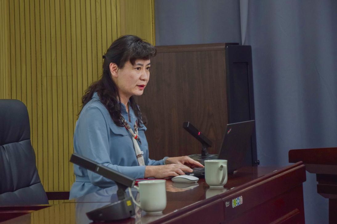 然后,政治学系副系主任贺琳凯老师进行课程思政融入式教学心得交流。她指出,要建立健全课程思政管理体制和运行机制,进行说课比赛典型案例教学。课程思政改革要进行点线面推广,全覆盖课程,在改进中强化,在创新中提高。