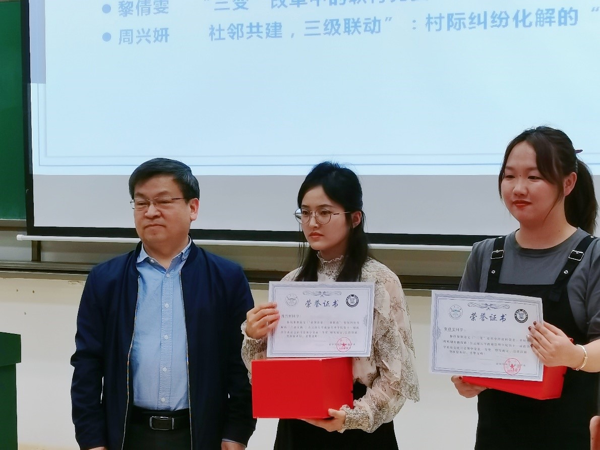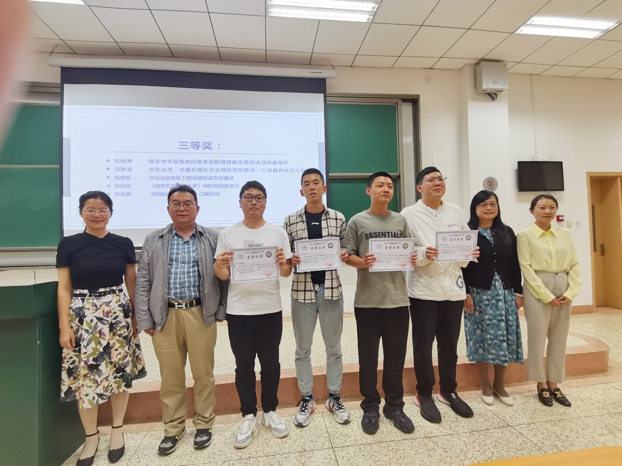 方盛举院长、木永跃副院长、申斌副院长、张会龙副院长、政治系四位老师为获得一、二、三等奖的同学进行颁奖。