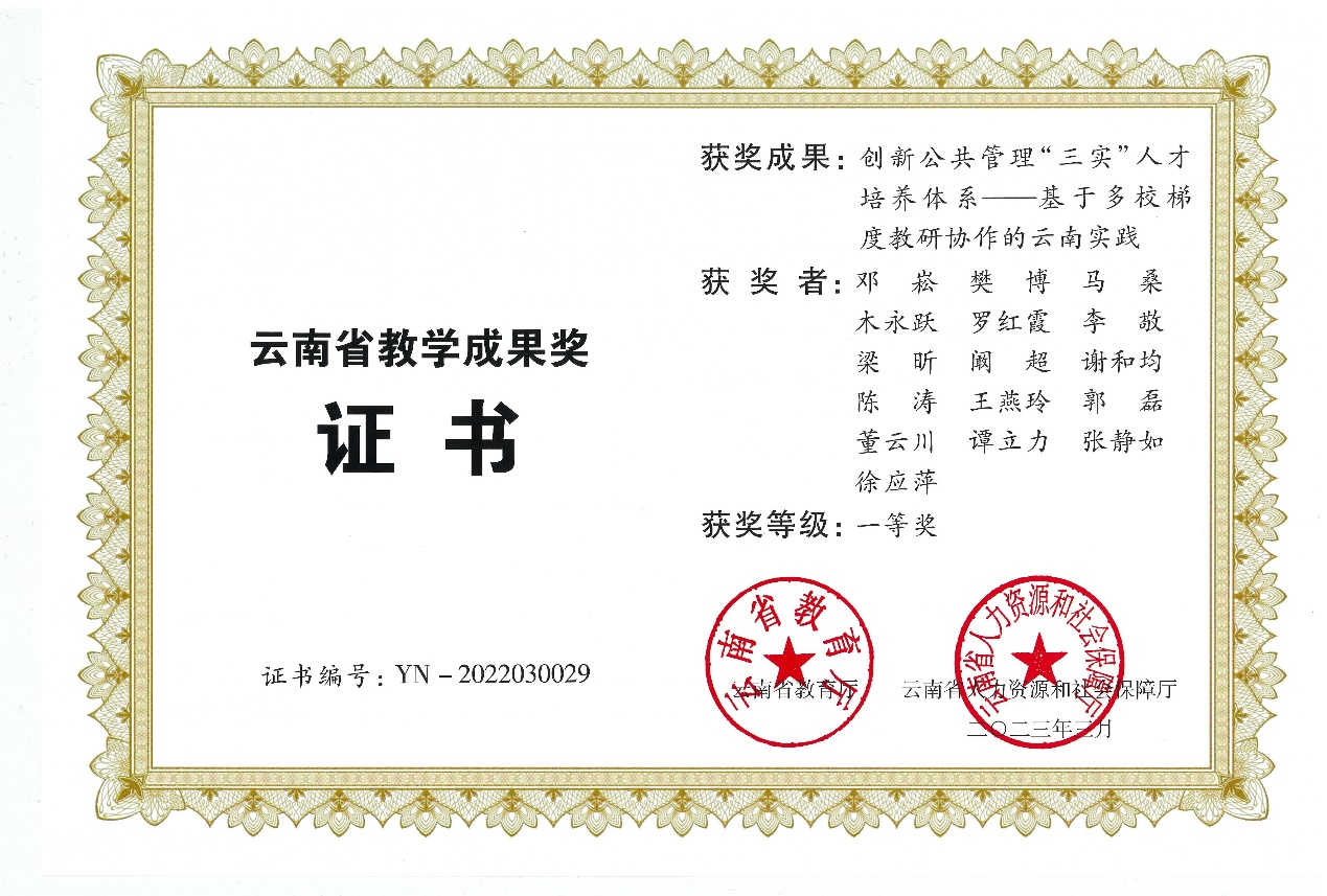 2023年3月,由邓崧教授领衔的团队成果《创新公共管理“三实”人才培养体系——基于多校梯度教研协作的云南实践》(YN-2022030029)获得云南省教学成果奖一等奖,标志着成果辐射进入新阶段,开启了公共管理教学研究和人才培养的新篇章,团队将向着一流学科建设目标继续前进。