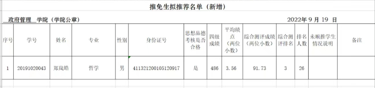 根据教育部相关文件精神,雷竞技raybet官网按照《雷竞技raybet登录入口2023年推荐优秀应届本科毕业生免试攻读研究生工作管理办法》要求,根据哲学专业建设实际与考研升学成效,获新增1个推免名额。在学生本人申请、民主推荐、公开评选的基础上,学院推免生遴选工作小组本着公开、公平、公正的原则,严格按推荐条件择优确定初选名单,现将雷竞技raybet官网2023年免试攻读研究生拟推荐增补名单公示如下。如有异议,请于2022年9月30日以前到学院办公室反映,联系电话:65033637 。