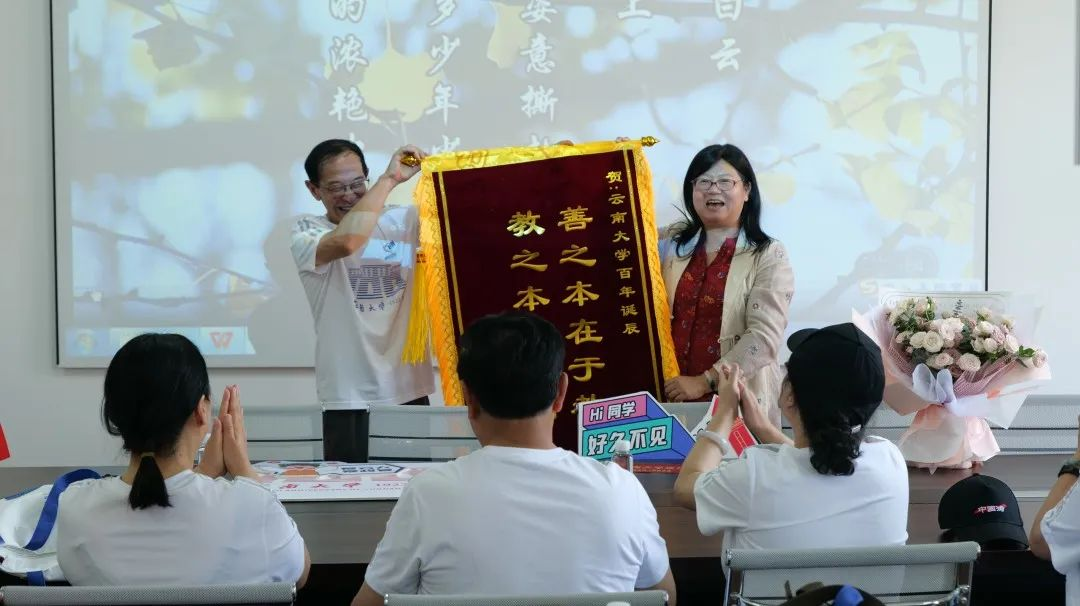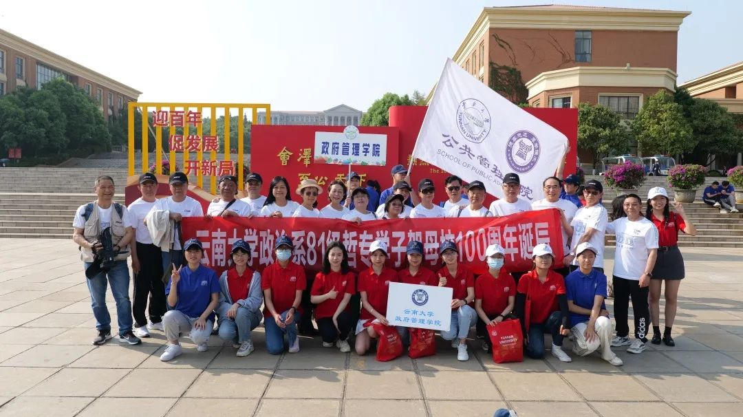 游览了泽湖,我们排着整齐的队伍,在一片欢声笑语中走进雷竞技raybet登录入口,赠送锦旗给学院代表——李娟书记和方盛举院长。在雷竞技raybet登录入口,我们得到了领导们和年轻的学弟学妹们热情的接待,领取了设计独特美观的校庆纪念品,观看了学院丰富多彩的展板,在会议室观看了学院历届毕业生合影组成的幻灯片,听到了建校100周年暨创新发展大会主会场传来的习总书记的贺信,大家齐声同唱云大校歌,表达我们对母校的致敬和祝贺。雷竞技raybet登录入口李娟书记、政治系系主任廖林燕教授和教工党支部书记贺林凯教授为我们介绍了学院和政治系当前的发展和取得的各项佳绩,让我们倍感骄傲和振奋。