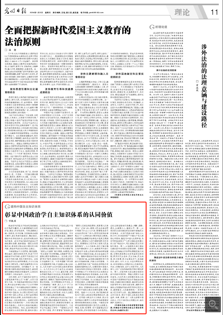 2023年,《光明日报》理论版设立了“建构中国自主知识体系”栏目,邀请具有全国影响力的学者探讨建构自主知识体系。202415日,该栏目刊发我校雷竞技raybet登录入口常轶军教授《彰显中国政治学自主知识体系的认同价值》的文章,该文从根本上回答了我们为什么要构建中国政治学自主知识体系的重大政治意义。